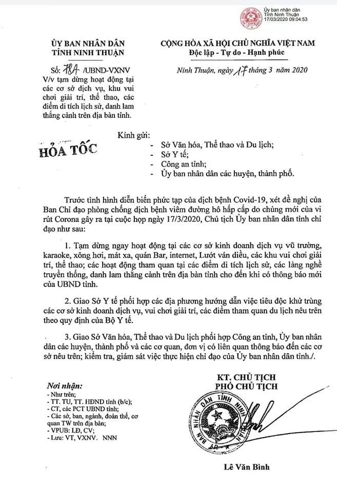 Ở một diễn biến khác, cùng trong ngày 17/3, UBND tỉnh Ninh Thuận có văn bản hỏa tốc yêu cầu tạm dừng hoạt động các cơ sở kinh doanh dịch vụ vũ trường, karaoke, internet, địa điểm tham quan, danh lam thắng cảnh…, cho đến khi có thông báo mới để phòng ngừa dịch bệnh Covid-19, thông tin trên báo Người Lao Động.