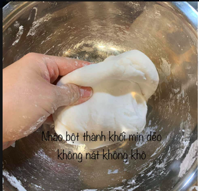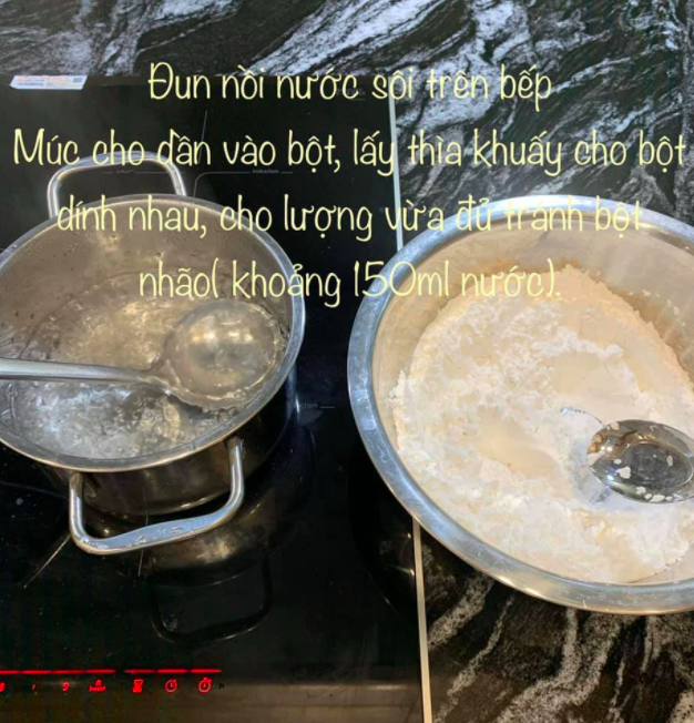 Đun nước sôi đổ dần vào âu bột khuấy cho bột quyện nhau rồi nhào mịn, cho nước từ từ để tránh bột nhão.
