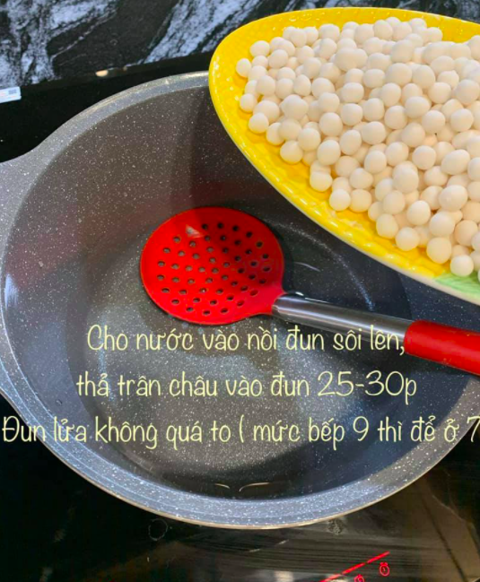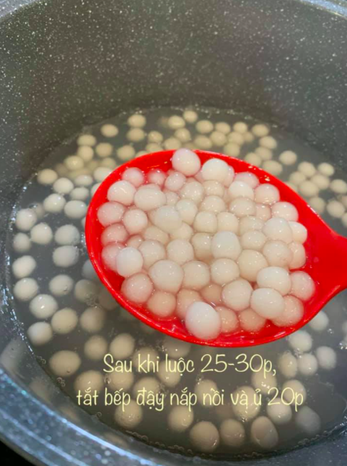 Đổ nước vào nồi đun sôi, thả trân châu vào đun lửa không to quá, luộc 25-30p sau đó tắt bếp, để nguyên trân châu ủ trong nồi đậy nắp 20p.