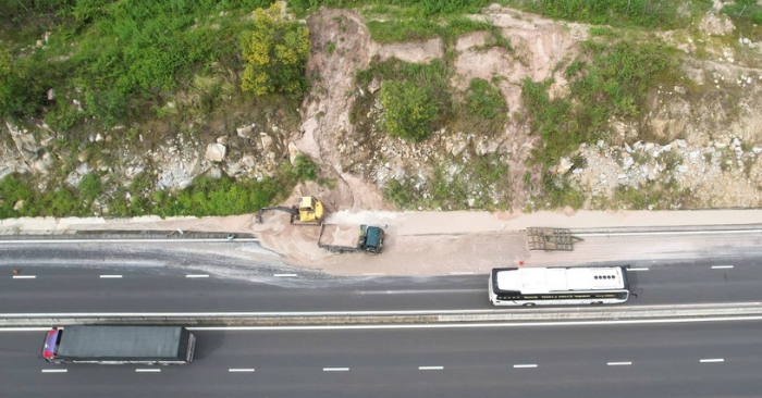 Sau mưa lớn, đất cát từ taluy sạt lở tràn xuống cao tốc Vĩnh Hảo – Phan Thiết, nghi do khai thác trái phép, gây cản trở giao thông.