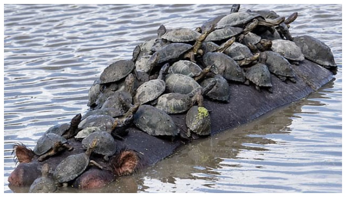 Theo Smith, bầy rùa cần tìm nơi để sưởi nắng. Chúng đã chọn tấm lưng của hà mã làm nơi nghỉ ngơi. Và con hà mã dường như “dễ tính”, không thấy phiền lòng khi bị những “vị khách nhỏ bé” quấy rầy để có một chuyến “lội sông” miễn phí.