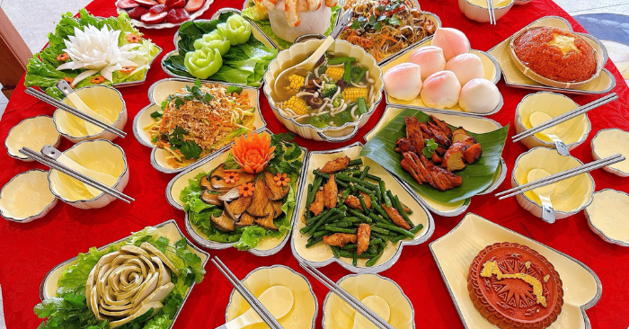 - Các món chay thanh đạm: nộm xoài chua ngọt, miến xào, rau củ luộc, canh nấm thập cẩm.
