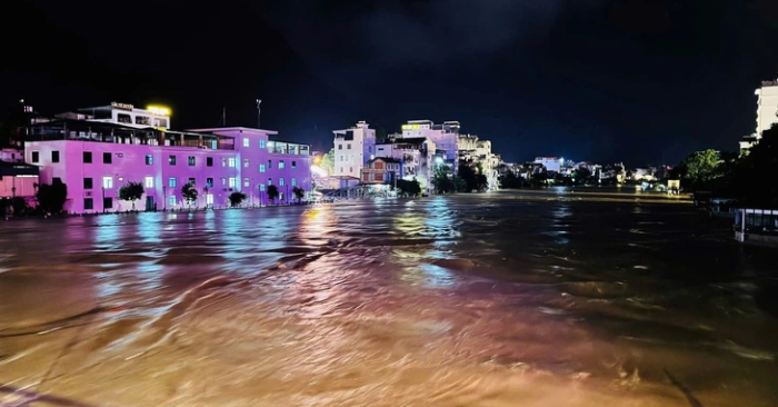 Nước lũ lên nhanh khiến nhiều phường trung tâm Hà Giang chìm trong biển nước. Nhiều điểm trũng ngập sâu, có nơi nước dâng gần tới tầng 2 nhà dân. Quảng trường và khu vực bến xe Hà Giang đều trong tình trạng ngập nặng.