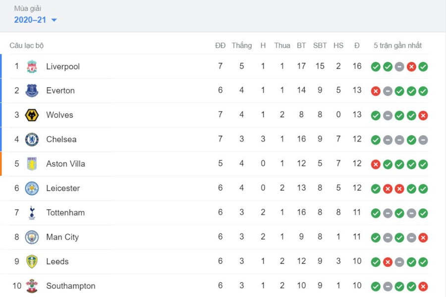 BXH Premier League nửa đầu vòng 7