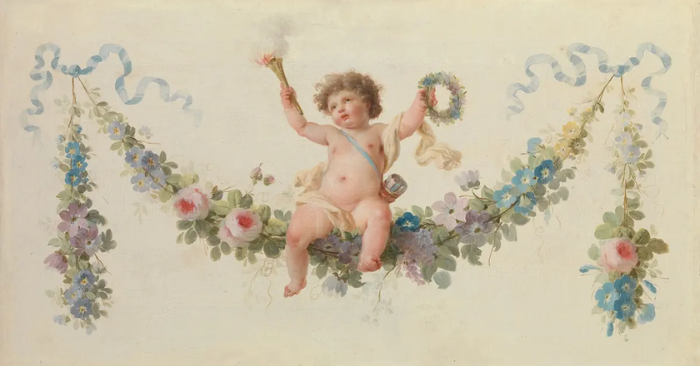 “Cupid ngồi trên vòng hoa”, khoảng 1770–1790, họa sĩ Pháp vô danh — tranh sơn dầu trên toan tại Bảo tàng Metropolitan — gợi rằng tình yêu lãng mạn không thể định nghĩa trọn vẹn: đôi khi như mũi tên xuyên ngực, vừa quen thuộc vừa bất ngờ, để mỗi người tự khám phá và định nghĩa lại theo cách riêng. Do đó, dù phong tục có thể biến chuyển, cảm giác hồi hộp của trái tim khi yêu vẫn sẽ tồn tại như một phần tất yếu của bản chất con người.
