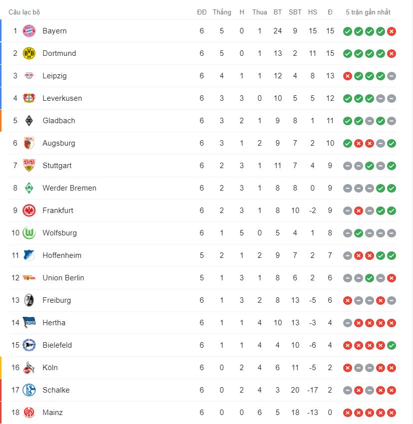 Bảng xếp hạng các giải đấu hàng đầu Châu Âu