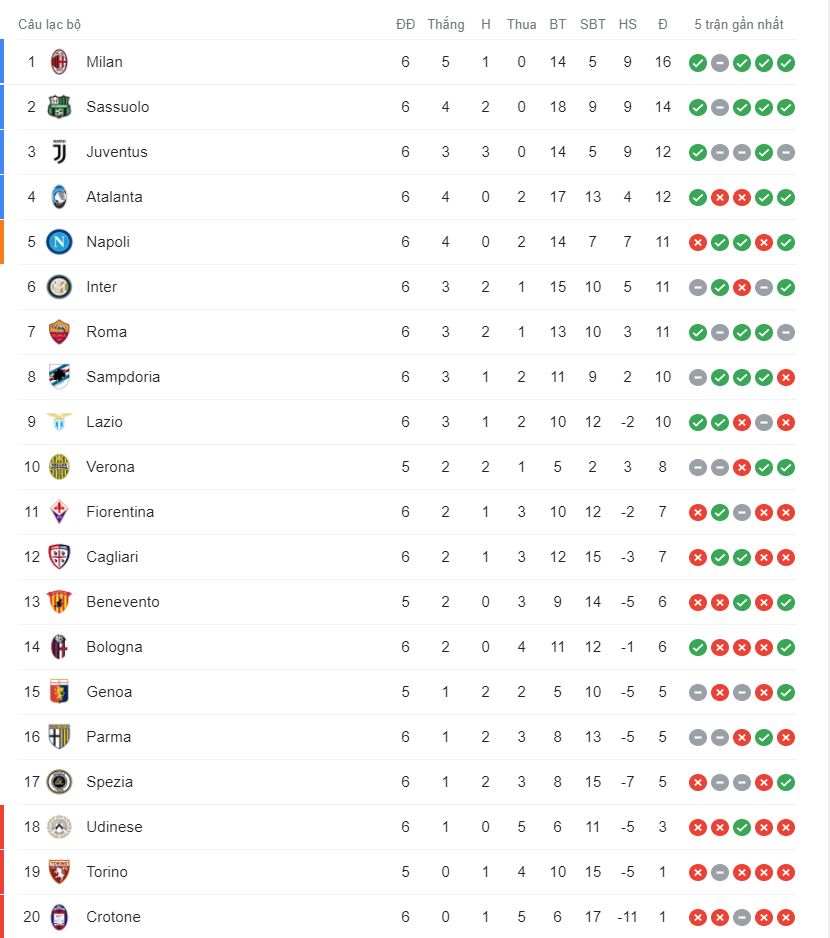Hiện AC Milan đang đứng đầu bảng xếp hạng Serie A với 16 điểm. Sau 6 vòng đấu, Đội bóng thành Milan đang có tới 5 trận thắng, và chỉ 1 trận hòa.