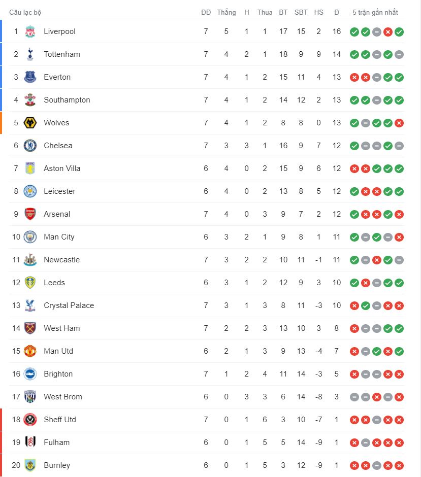 Bảng xếp hạng các giải đấu hàng đầu Châu Âu