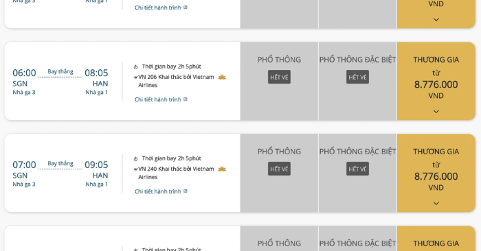 Các chặng đến Hà Nội, Vinh, Thanh Hóa, Hải Phòng có giá từ 1,6 triệu đồng. Chặng TPHCM – Hà Nội khứ hồi dao động 5,5-7,4 triệu đồng. Hạng phổ thông và phổ thông đặc biệt chặng này đã hết vé từ 30/1/2026 đến 17/2/2026. Hành khách phải chọn hạng thương gia, giá gần 8,8 triệu đồng. Giá vé tăng cao khiến nhiều người khó tiếp cận.