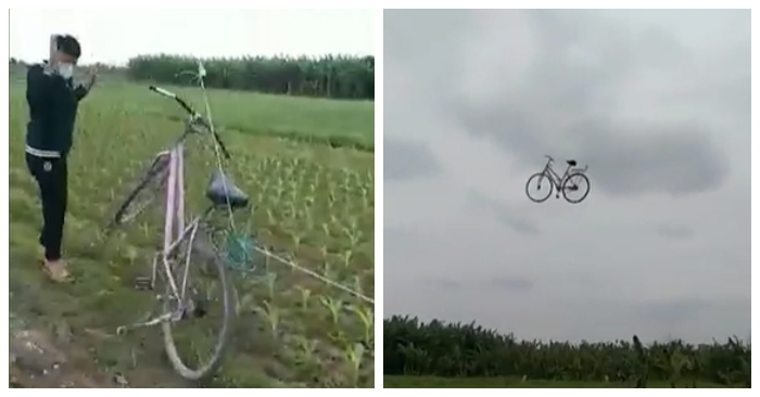 Hai thanh niên thả diều thả cả xe đạp lên trời cao (ảnh cắt từ video).