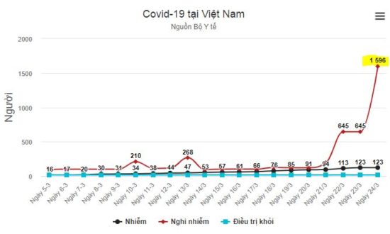 Con số nghi nhiễm của Việt Nam hôm 24/3 là 1.596 trường hợp (như hình dưới đây), và sau đó tăng nhẹ trong 2 ngày tiếp theo. Tuy nhiên đến ngày 27/3, số nghi nhiễm đã vọt lên hơn 3.200 trường hợp.